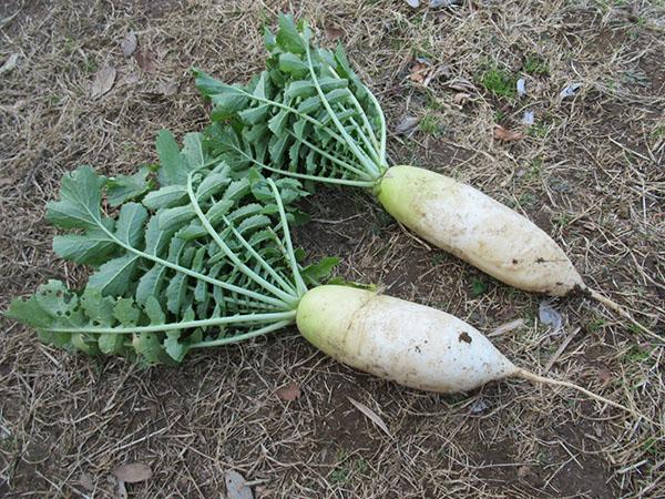 ダイコンが思うように生育しない理由として思い当たるのは、耕耘が足りなかった、発芽後の初期の生育期に、間引きや雑草の処理、マルチを敷くのが遅れたことなどかな? と。