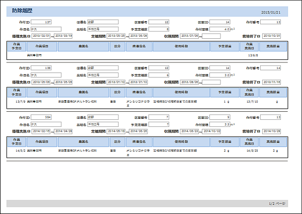 ここでは、作業日誌の作業記録や防除履歴で登録した、作付ごとの防除履歴を印刷することができます。