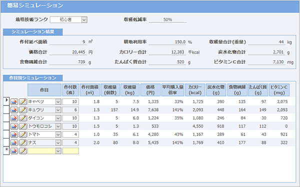 作目別シミュレーションで、作目を選択し、作付数(株)を入力するだけで、面積や収穫量等のシミュレーション結果が出ます。