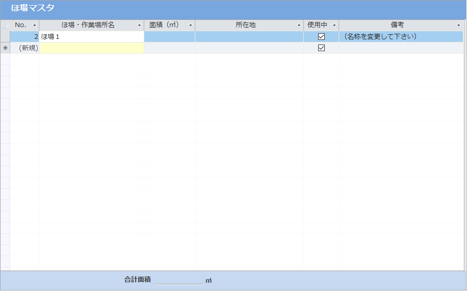 ほ場マスタは、お使いの畑を少なくとも1つは必要ですが、初期値として「ほ場1」が登録されています。