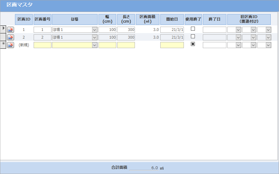 区画マスタは、お使いの畑をいくつかの区画に分けて管理しますので、少なくとも1つ以上の区画を登録する必要があります。