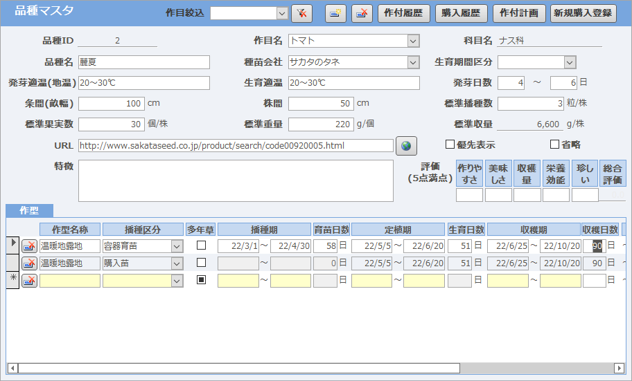 ここでは、購入した種の袋の裏や、種苗メーカーのサイト等に記載されている内容を登録します。