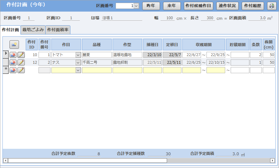 同じ要領で、1つの区画に3つの作付を作成しました。